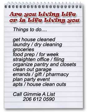 Personal Assistant Seattle can help you out with just about all your needs. A combination of Your very own Personal Assistant on the go, to your House Keeper / Organizer, Personal Party Planner, Grocery Shopper, Laundress / Cook or a little help in your office too. Oh and don't forget your Personal Shopper, etc. etc. etc. Personal Assistant Seattle is ready to help you and give you back the gift of time.
